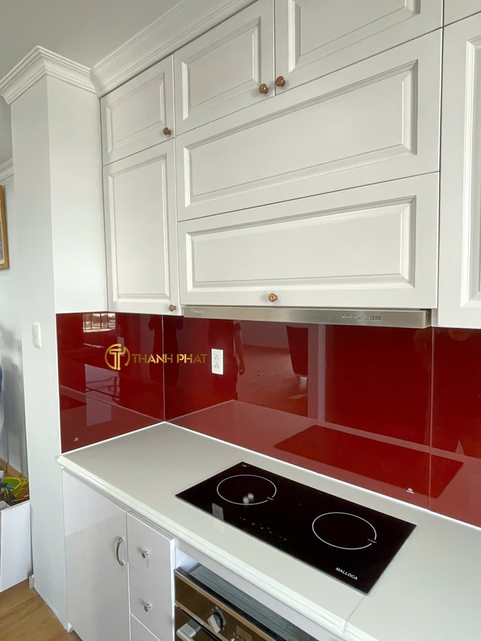 Kính bếp chịu lực,chịu nhiệt gấp 8 lần kính thường, chất liệu sơn chịu nhiệt 5 – 8 lớp. Được bằng máy phun sơn tự động, phủ bóng chống ố ẩm chống trầy mặt sau kính.
