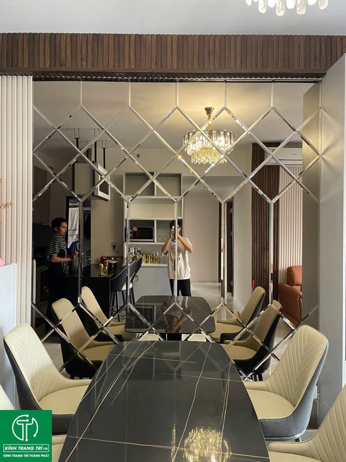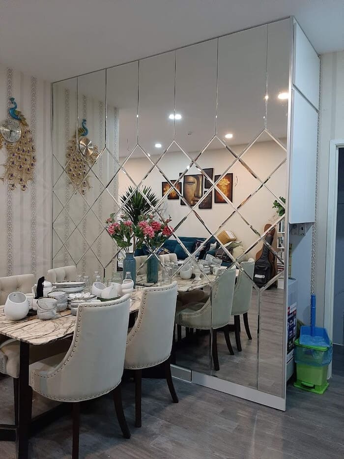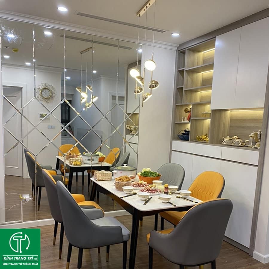 Kính trang trí phòng ăn có nhiều kiểu dáng, màu sắc khác nhau, giúp tăng tính thẩm mỹ cho phòng khách. Bạn có thể lựa chọn gương ghép trang trí với khung gỗ, khung kim loại hoặc khung đồng để phù hợp với phong cách thiết kế nội thất của căn phòng.