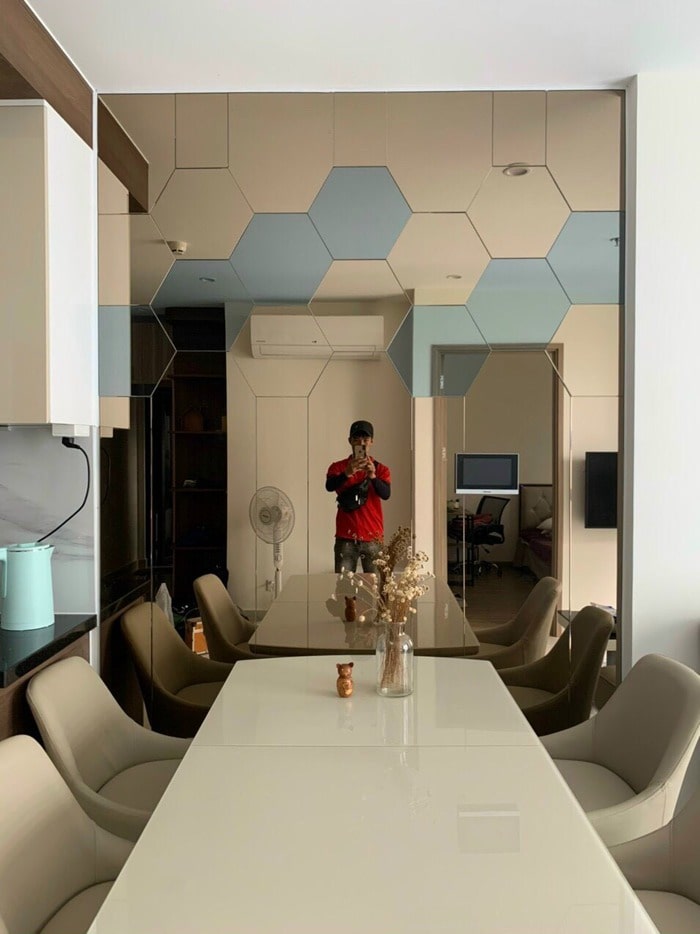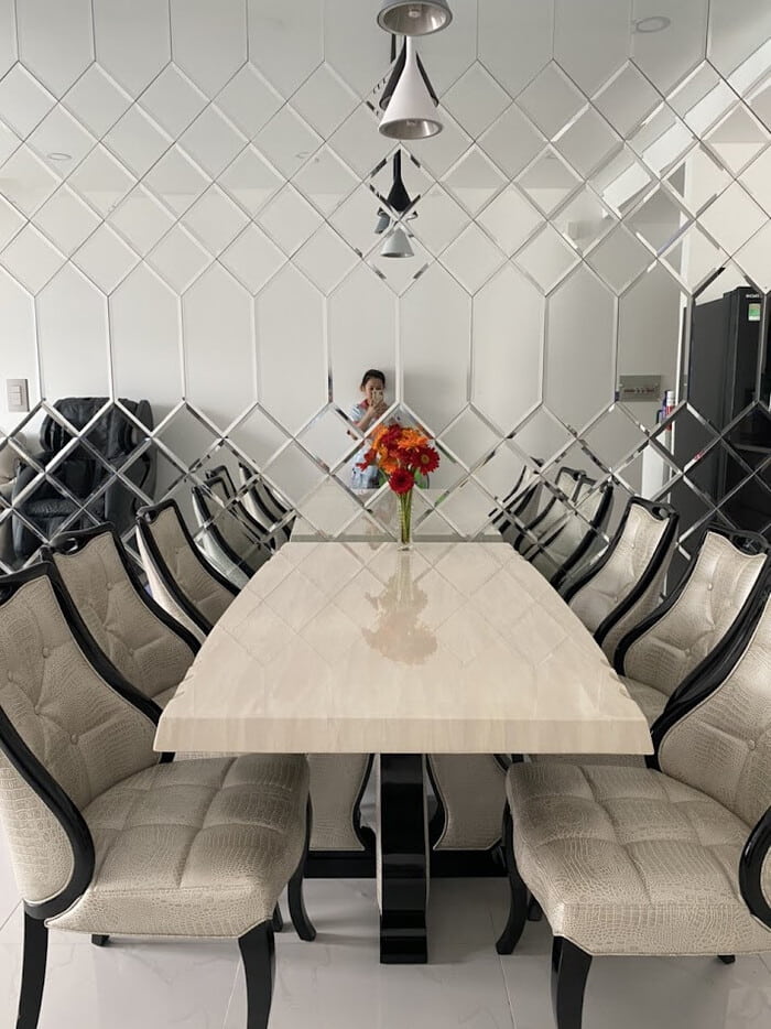 Gương, kính thủy có khả năng phản chiếu ánh sáng, giúp không gian phòng ăn trở nên rộng rãi, thoáng đãng hơn. Đặc biệt, nếu bạn lắp gương trang trí ở vị trí chiến lược. Nó có thể tạo ra hiệu ứng gương phản chiếu liên tục, tạo cảm giác không gian mở rộng hơn.