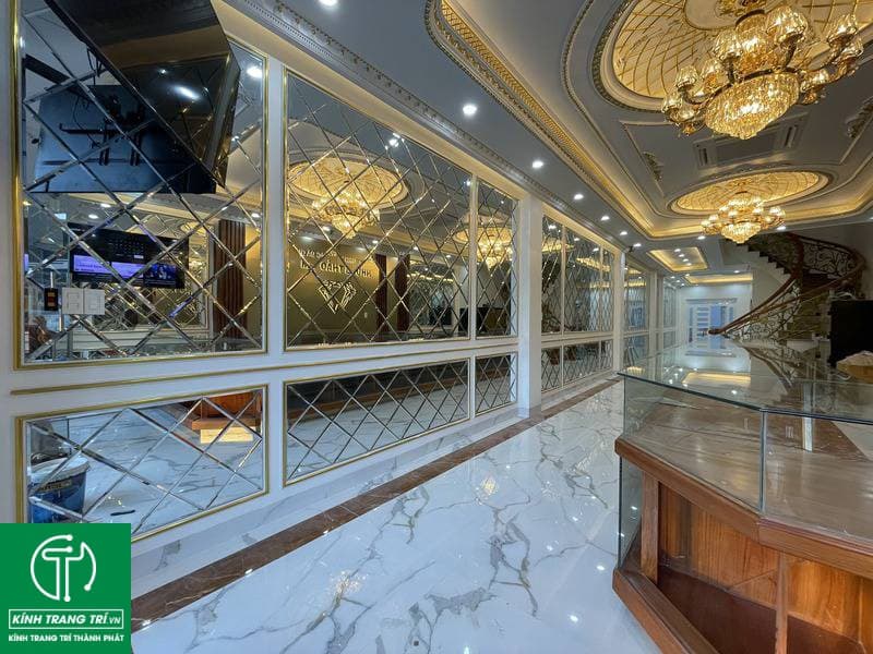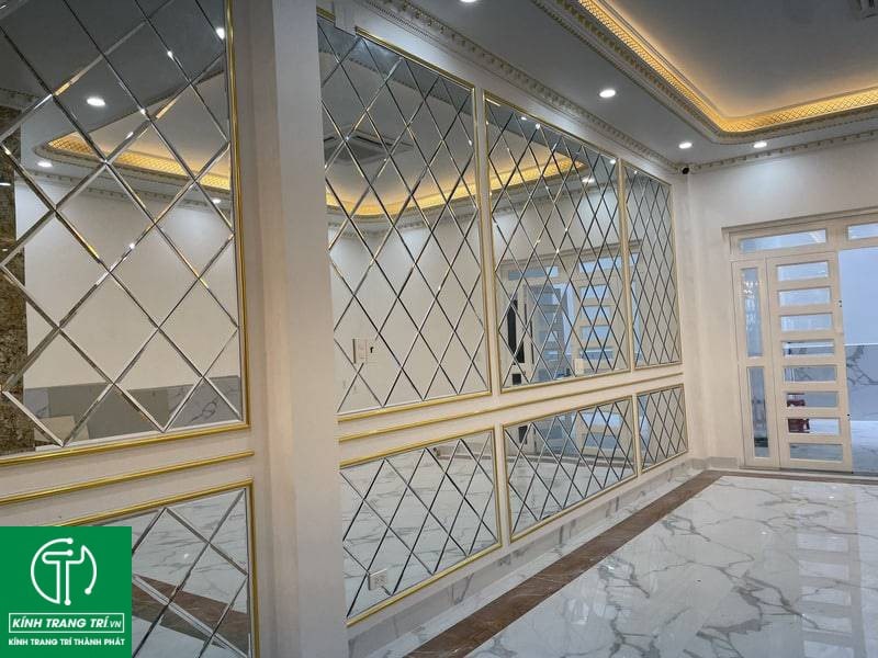 Gương trang trí tiệm vàng phải được an toàn khi bạn thi công đúng cách. Silicon được rải đều trên diện tích trên các tấm gương và kính được dán bám chặt vào tường.