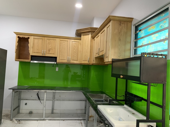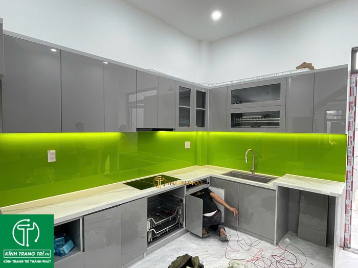 Giá thi công trọn gói kính ốp bếp màu xanh non là bao nhiêu?