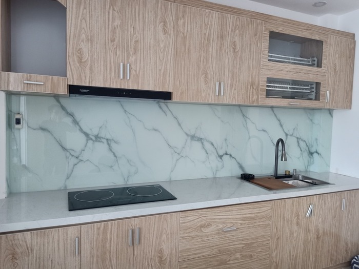 Bạn đang muốn tìm vật liệu để ốp tường bếp thay cho gạch men truyền thống. Hãy sử dụng kính ốp bếp vân đá giúp làm cho không gian bếp trở nên đẹp mắt và hiện đại hơn. Mà còn có tính năng bảo vệ tường khỏi các vết bẩn, dầu mỡ và nước trong quá trình nấu nướng.